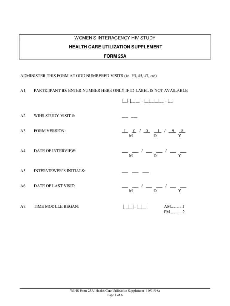 WOMEN INTERAGENCY HIV STUDY HEALTH CARE UTILIZATION SUPPLEMENT FORM 25AADMINISTER THIS FORM AT ODD NUMBERED VISITS (i.e. #3, #5, #7, etc)A1.PARTICIPANT ID: ENTER NUMBER HERE ONLY IF ID LABEL IS NOT