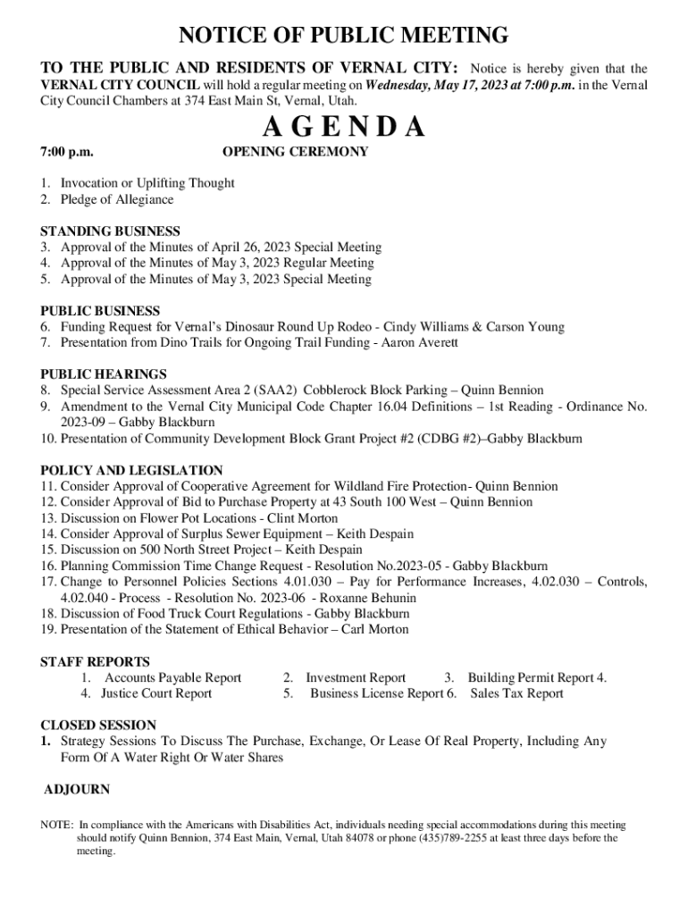 NOTICE OF PUBLIC MEETING TO THE PUBLIC AND RESIDENTS OF VERNAL CITY: Notice is hereby given that the VERNAL CITY COUNCIL will hold a regular meeting on Wednesday, May 17, 2023, at 7:00 p.m. in the