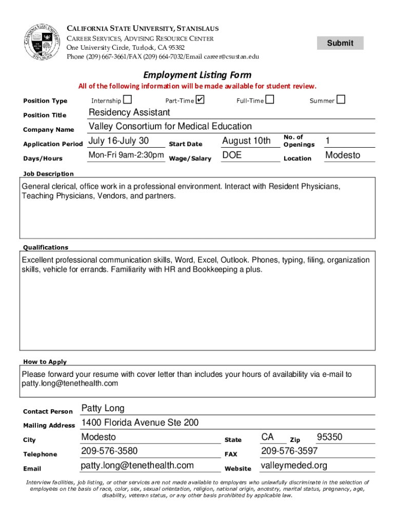 CALIFORNIA STATE UNIVERSITY, STANISLAUS CAREER SERVICES, ADVISING RESOURCE CENTERSubmitOne University Circle, Turlock, CA 95382 Phone (209) 6673661/FAX (209) 6647032/Email career@csustan.eduEmployment