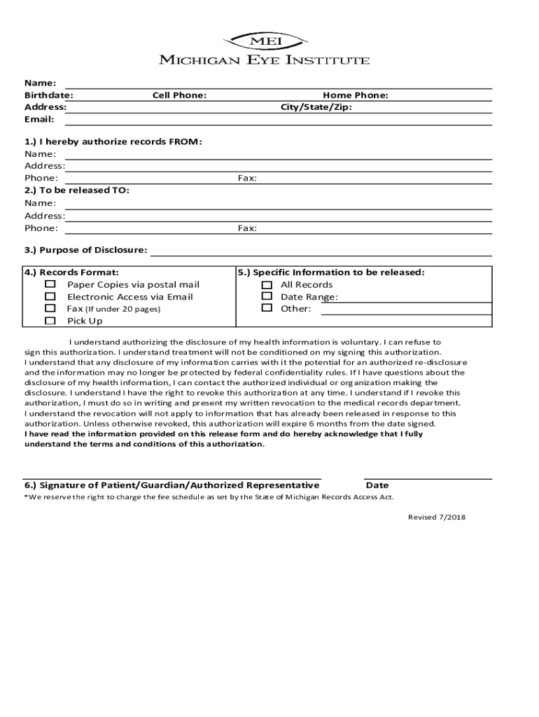 Name: Birthdate: Address: Email:Cell Phone:1.) I hereby authorize records FROM: Name: Address: Phone: 2.) To be released TO: Name: Address: Phone:Home Phone: City/State/Zip:Fax:Fax:3.) Purpose of