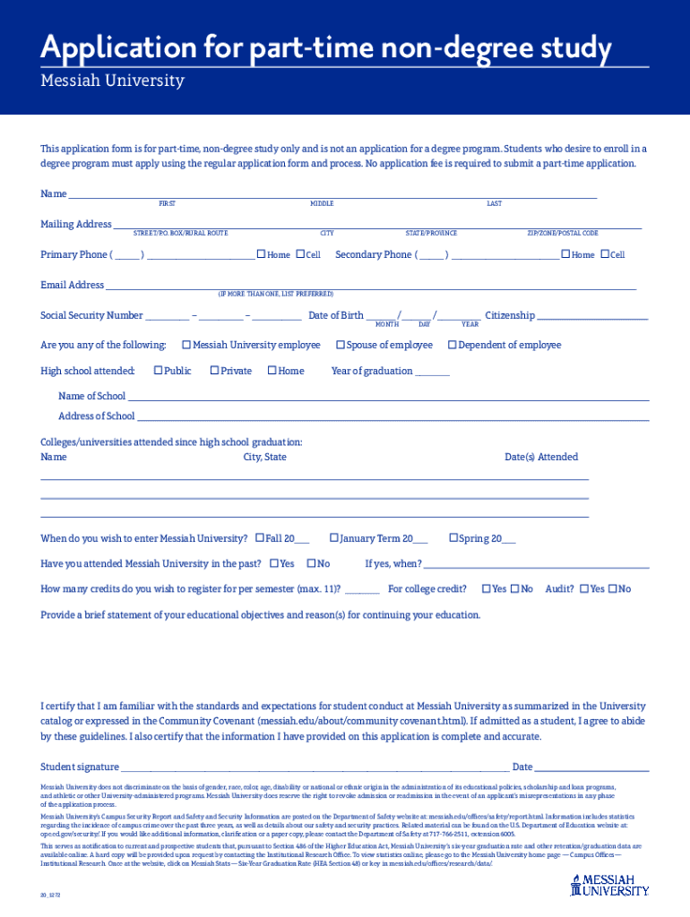 Messiah UniversityThis application form is for part-time, nondegree study only and is not an application for a degree program. Students who desire to enroll