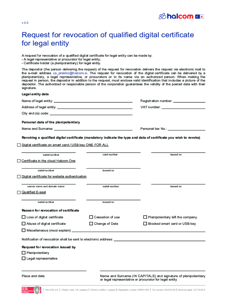 V 5.0Request for revocation of qualified digital certificate for legal entity A request for revocation of a qualified digital certificate for legal entity can be made by: A legal representative or
