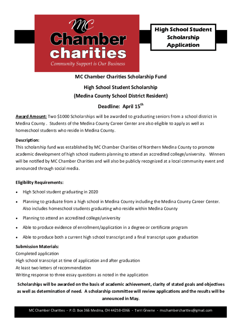 High School Student Scholarship Application MC Chamber Charities Scholarship Fund High School Student Scholarship (Medina County School District Resident) Deadline: April 15th Award Amount: Two $1000