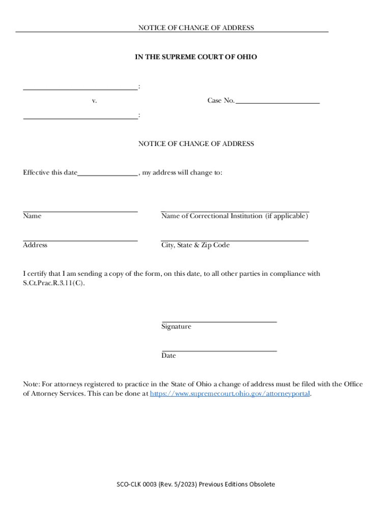 NOTICE OF CHANGE OF ADDRESS IN THE SUPREME COURT OF OHIO : v. Case No. NOTICE OF CHANGE OF ADDRESSEffective this date, my address will change to:Namesake of Correctional Institution (if applicable)Addressing,