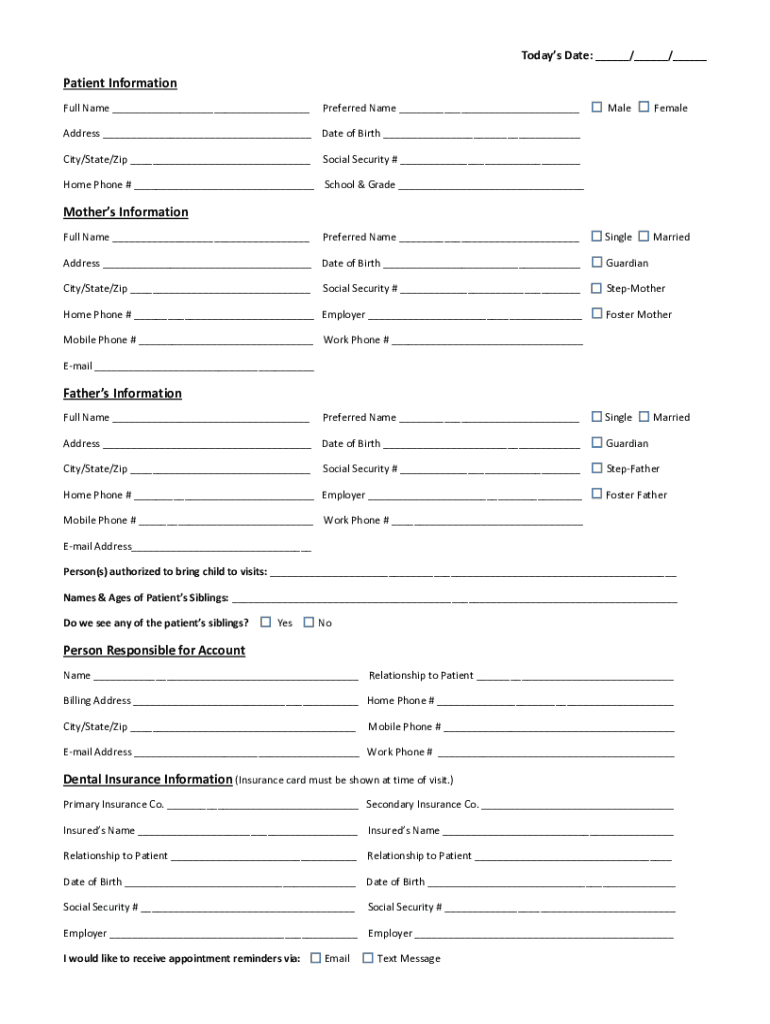 Today's Date: ___/___/___Patient Information Full Name ___Preferred Name ___MaleFemaleSingleMarriedAddress ___ Date of Birth ___ City/State/Zip ___Social Security # ___Home Phone # ___ School & Grade