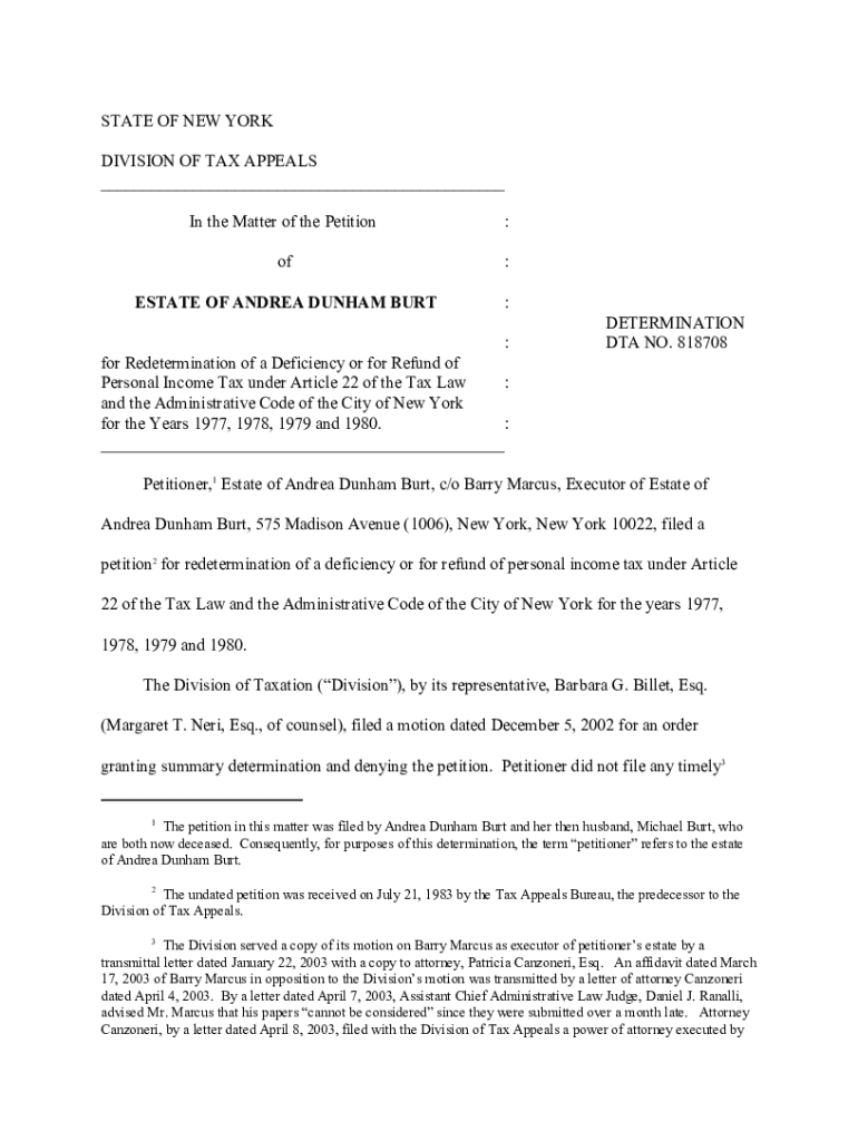 STATE OF NEW YORK DIVISION OF TAX APPEALS ___ In the Matter of the Petition:of:ESTATE OF ANDREA DUNHAM BURT:: for Redetermination of a Deficiency or for Refund of Personal Income Tax under Article