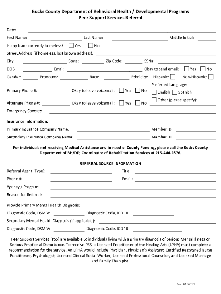 Bucks County Department of Behavioral Health / Developmental Programs Peer Support Services Referral Date: First Name:Last Name:Is applicant currently homeless? Middle Initial:Street Address (if homeless,