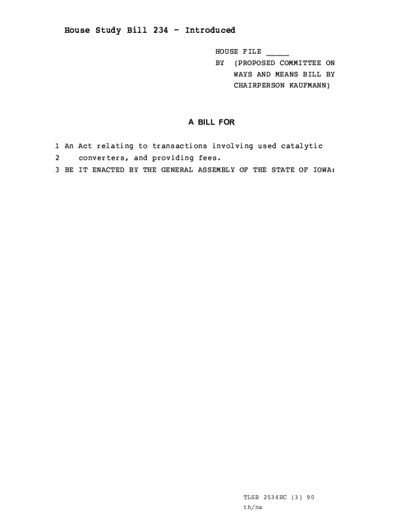House Study Bill 234 Introduced HOUSE FILE ___ BY (PROPOSED COMMITTEE ON WAYS AND MEANS BILL BY CHAIRPERSON KAUFMANN)A BILL FOR1 An Act relating to transactions involving used catalytic 2 converters,