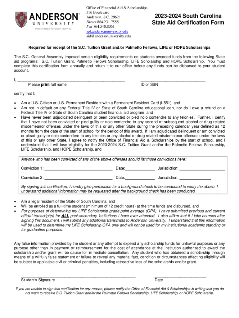 Office of Financial Aid & Scholarships 316 Boulevard Anderson, S.C. 29621 Direct 864.231.7555 Fax 864.540.8361 aid.andersonuniversity.edu aid@andersonuniversity.edu20232024 South Carolina State Aid