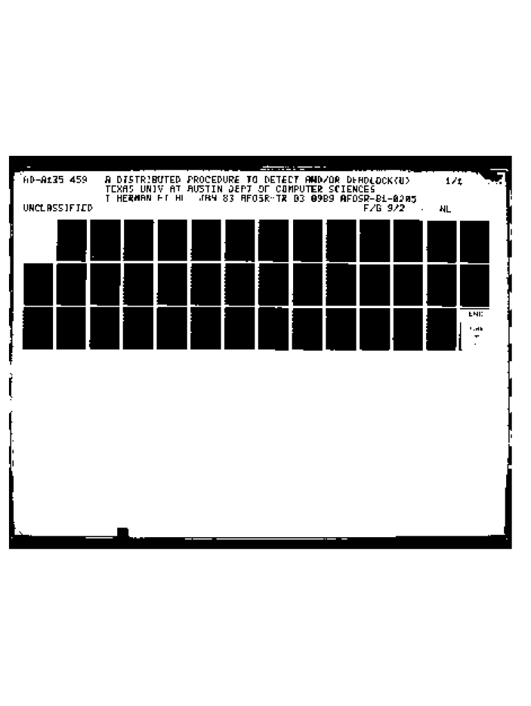 FlDAI35 459UNCLASSIFIEDA DISTRIBUTED PROCEDURE TO DETECT AND/OR DEADLOCK(U) TEXAS UNIV AT AUSTIN DEPT OF COMPUTER SCIENCES T HERMAN ET AL. JAN 83 AFOSRTR836989 AFOSR8i6205 F/fl 9/2i/iNEhhEEommoEmoiI