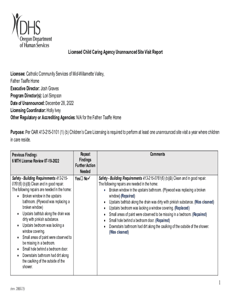 Licensed Child Caring Agency Unannounced Site Visit ReportLicensee: Catholic Community Services of MidWillamette Valley, Father Gaffe Home Executive Director: Josh Graves Program Director(s): Lori