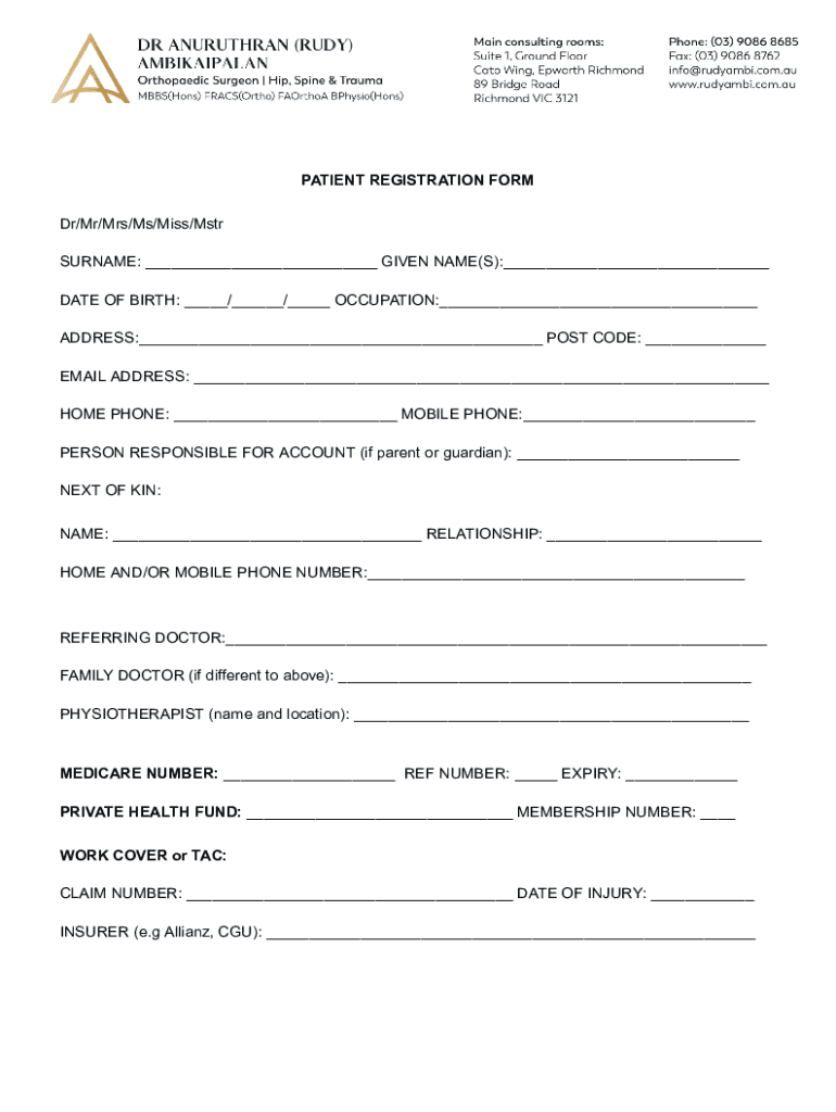 PATIENT REGISTRATION FORM Dr/Mr/Mrs/Ms/Miss/MTR SURNAME: ___ GIVEN NAME(S):___ DATE OF BIRTH: ___/___/___ OCCUPATION:___ ADDRESS:___ POST CODE: ___ EMAIL ADDRESS: ___ HOME PHONE: ___ MOBILE PHONE:___