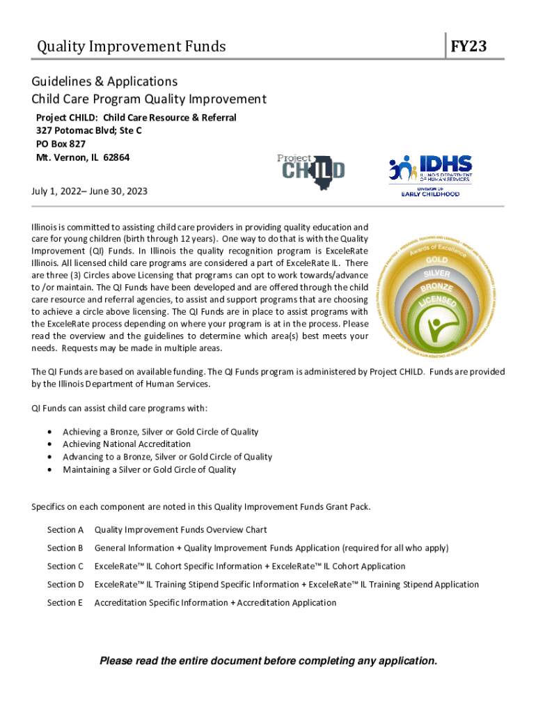 Quality Improvement FundsFY23Guidelines & Applications Child Care Program Quality Improvement Project CHILD: Child Care Resource & Referral 327 Potomac Blvd; Ste C PO Box 827 Mt. Vernon, IL 62864