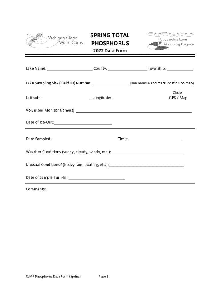 SPRING TOTAL PHOSPHORUS 2022 Data Formulae Name: ___ County: ___ Township: ___ Lake Sampling Site (Field ID) Number: ___ (see reverse and mark location on map) CircleLatitude: ___ Longitude: ___ GPS