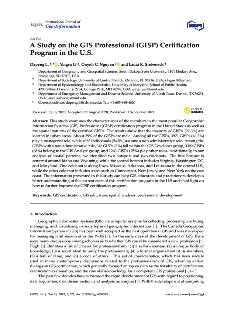 International Journal ofGeoInformation Article Study on the GIS Professional (ISP) Certification Program in the U.S. Dating Li 1, *, Xingu Li 2, Quinn C. Nguyen 3 1 2 3 4×and Laura K. Seebeck 4Department