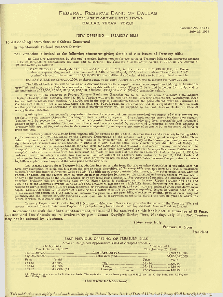 Get the free New Offering - Treasury Bills, Circular No. 67-146 - fraser stlouisfed