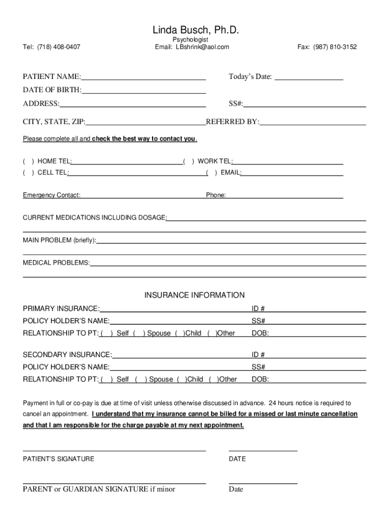 Linda Busch, Ph.D. Psychologist Email: LBshrink@aol.comTel: (718) 4080407Fax: (987) 8103152Todays Date:PATIENT NAME: DATE OF BIRTH: ADDRESS:SS#:CITY, STATE, ZIP:REFERRED BY:Please complete all and