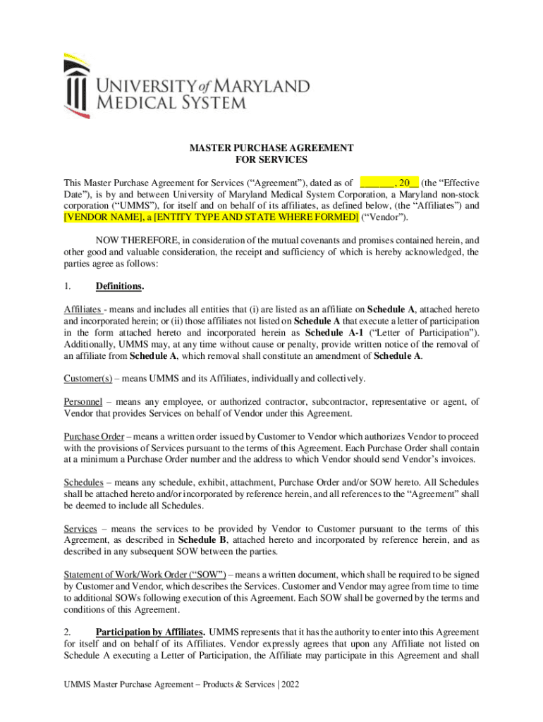 MASTER PURCHASE AGREEMENT FOR SERVICES This Master Purchase Agreement for Services (Agreement), dated as of ___, 20__ (the Effective Date), is by and between University of Maryland Medical System