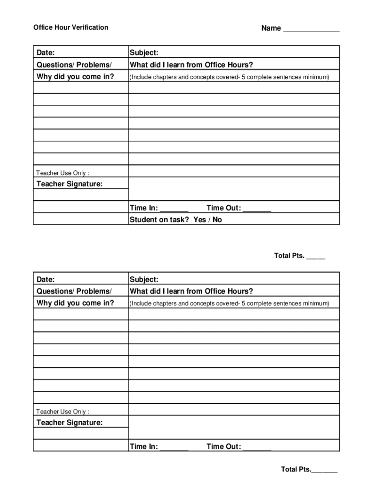 Office Hour VerificationName ___Date:Subject:Questions/ Problems/What did I learn from Office Hours? Why did you come in?(Include chapters and concepts covered 5 complete sentences minimum)Teacher