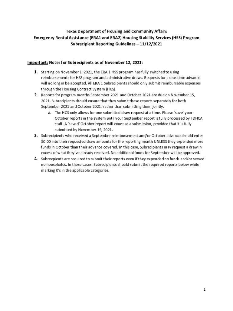 Texas Department of Housing and Community Affairs Emergency Rental Assistance (ERA1 and ERA2) Housing Stability Services (HSS) Program Subrecipient Reporting Guidelines 11/12/2021Important: Notes