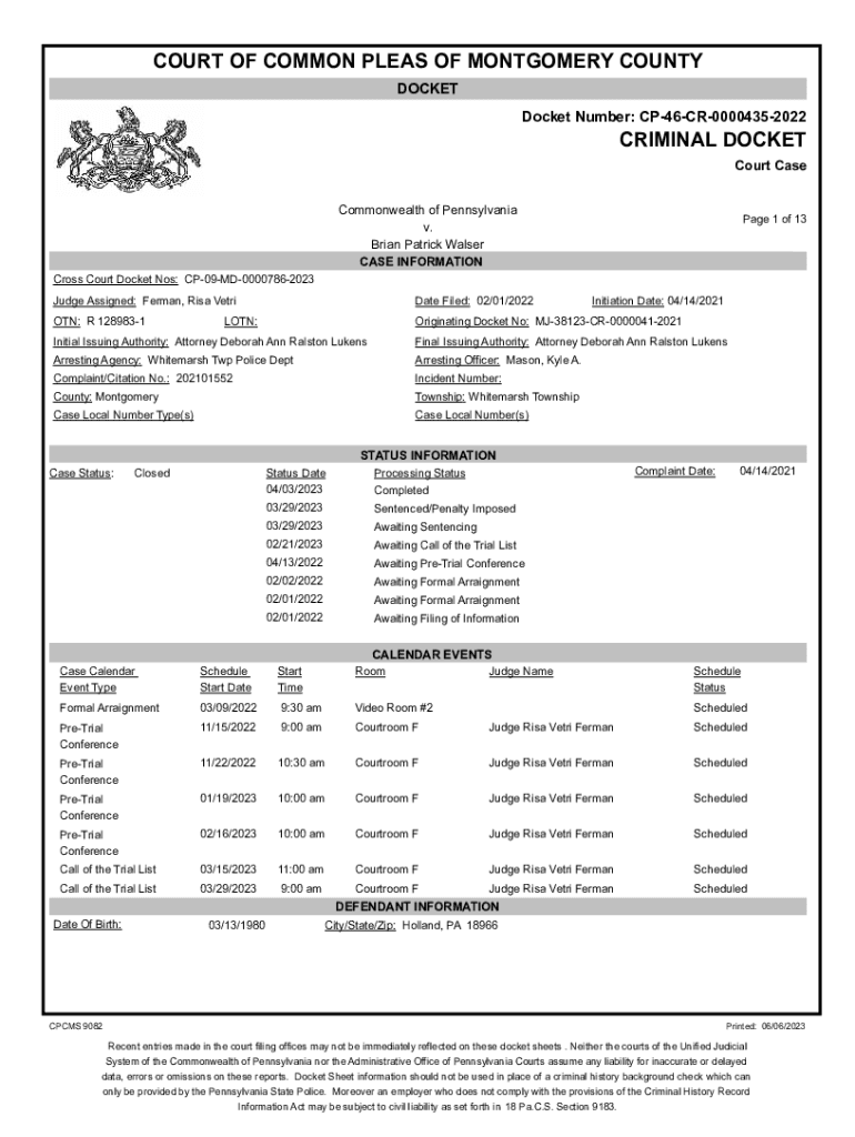 COURT OF COMMON PLEAS OF MONTGOMERY COUNTY DOCKET Number: CP46CR00004352022CRIMINAL DOCKET Court Case Commonwealth of Pennsylvania v. Brian Patrick Walker CASE INFORMATION Page 1 of 13Cross Court