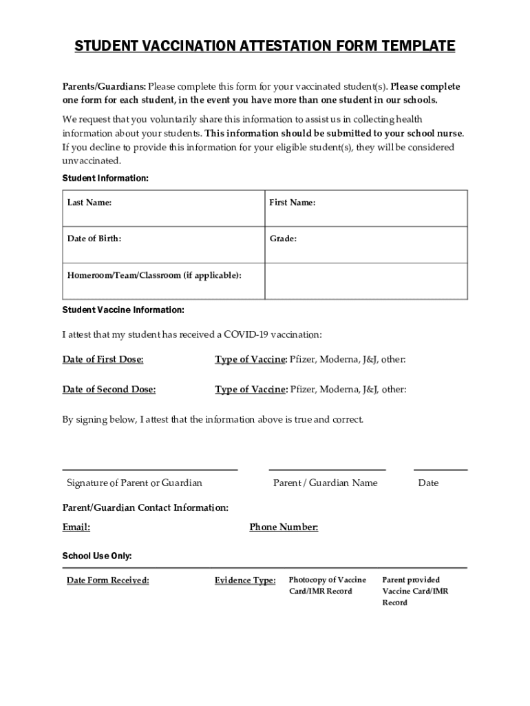 STUDENT VACCINATION ATTESTATION FORM TEMPLATE Parents/Guardians: Please complete this form for your vaccinated student(s). Please complete one form for each student, in the event you have more than