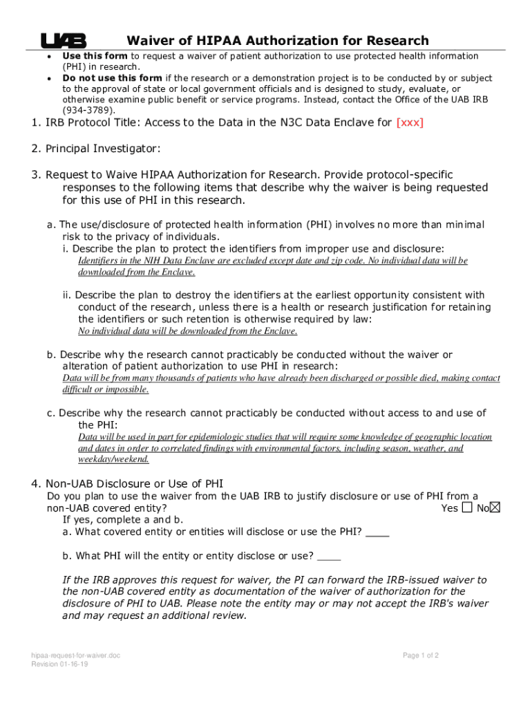 Waiver of HIPAA Authorization for Research Use this form to request a waiver of patient authorization to use protected health information (PHI) in research. Do not use this form if the research or