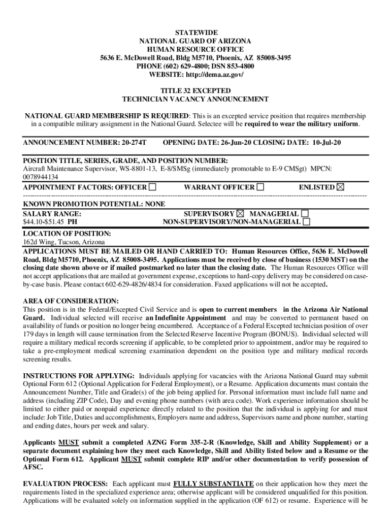 STATEWIDE NATIONAL GUARD OF ARIZONA HUMAN RESOURCE OFFICE 5636 E. McDowell Road, Bldg M5710, Phoenix, AZ 850083495 PHONE (602) 6294800; DSN 8534800 WEBSITE: http://dema.az.gov/ TITLE 32 EXCEPTED TECHNICIAN
