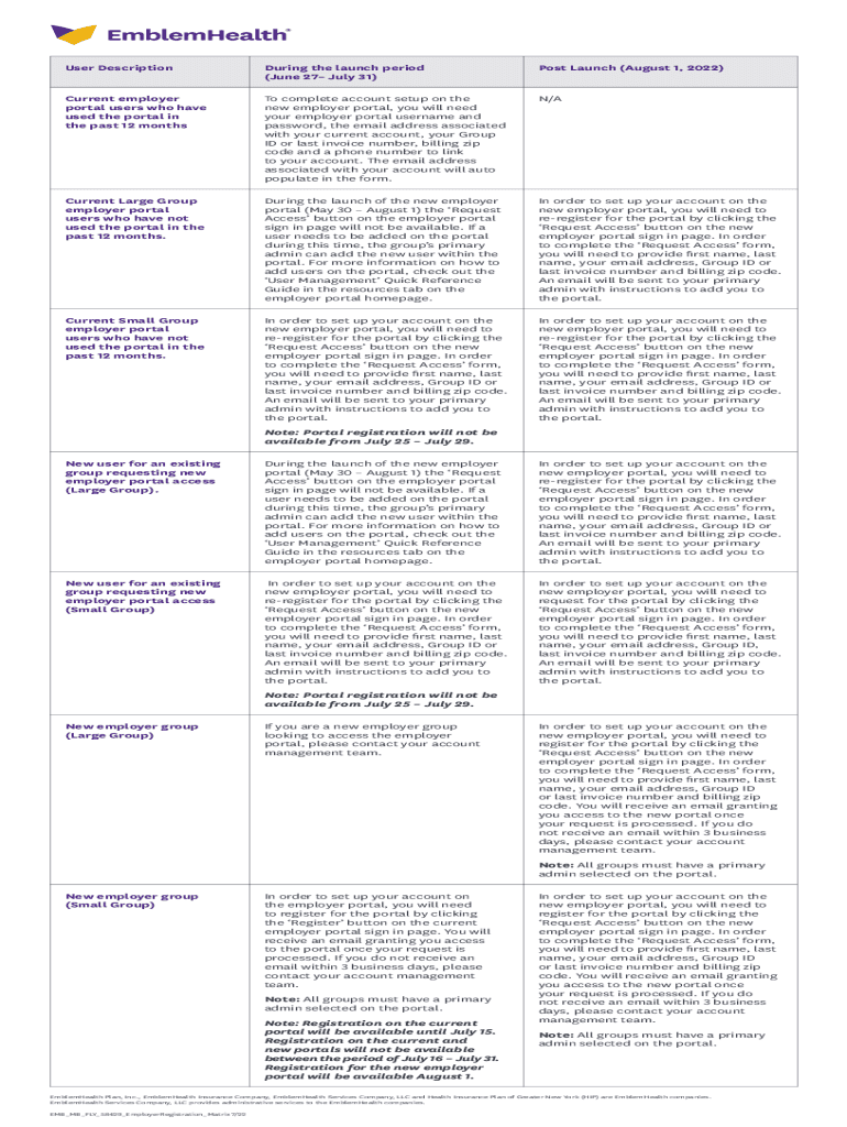 User DescriptionDuring the launch period (June 27 July 31)Post Launch (August 1, 2022)Current employer portal users who have used the portal in the past 12 months complete account setup on the new