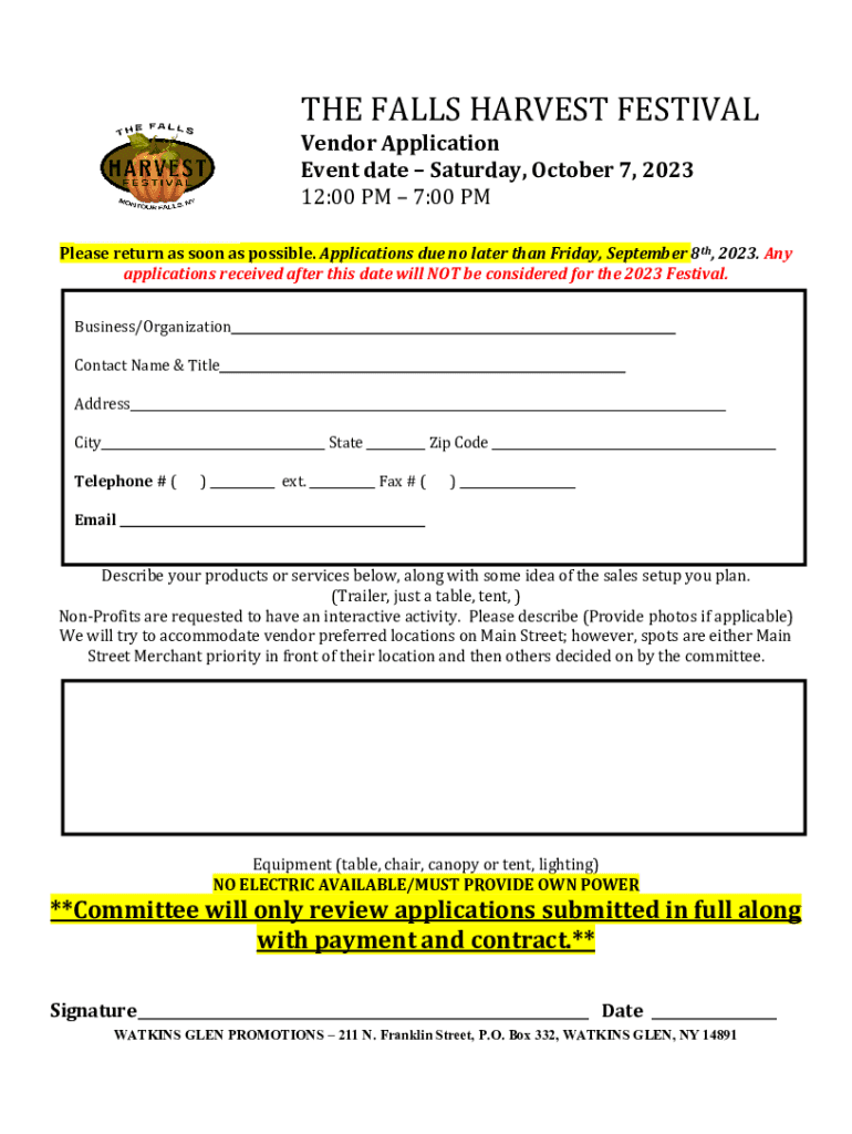 THE FALLS HARVEST FESTIVALVendor Application Event date Saturday, October 7, 2023 12:00 PM 7:00 PMP lease return as soon as possible. Applications due no later than Friday, September 8th, 2023. Any