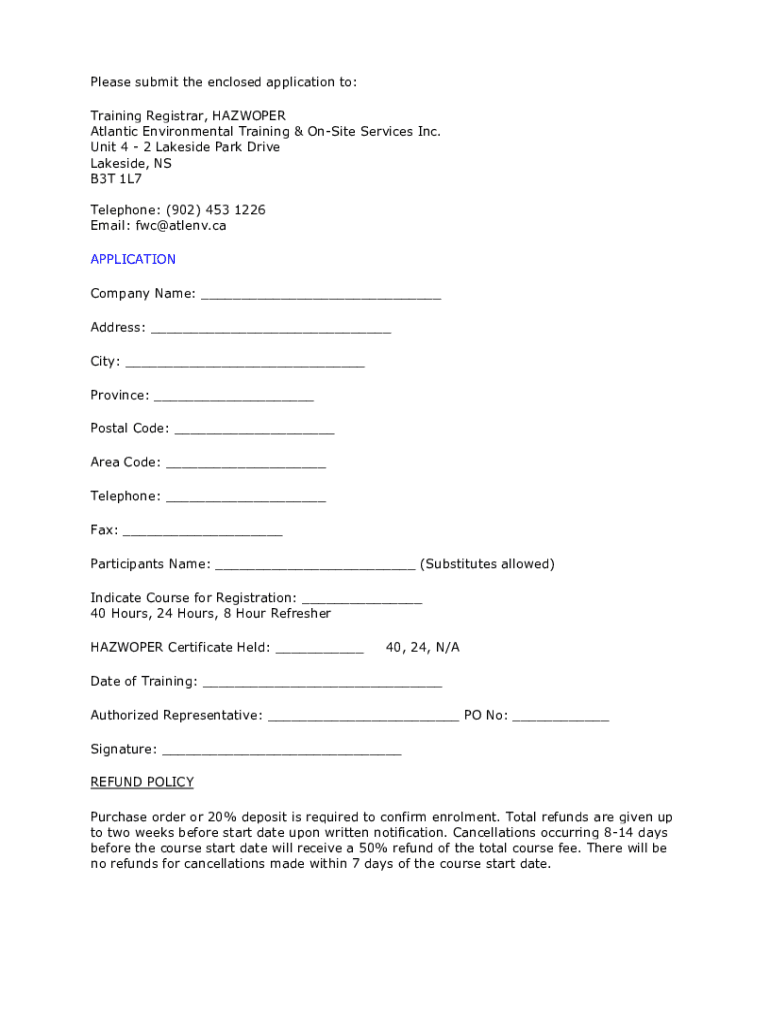 Please submit the enclosed application to: Training Registrar, HARPER Atlantic Environmental Training & Onsite Services Inc. Unit 4 2 Lakeside Park Drive Lakeside, NS B3T 1L7 Telephone: (902) 453