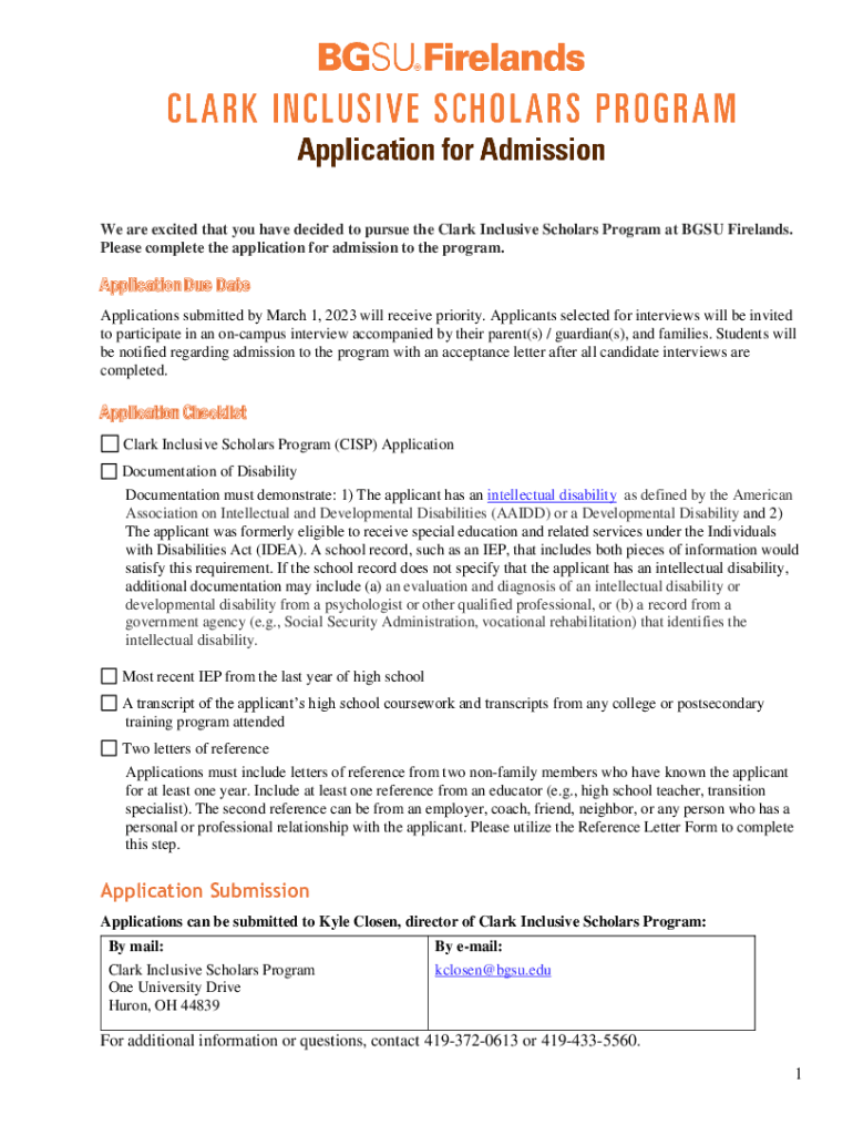 We are excited that you have decided to pursue the Clark Inclusive Scholars Program at BGS Fir elands. Please complete the application for admission to the program. Application Due Date Applications