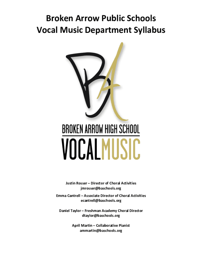 Broken Arrow Public Schools Vocal Music Department Syllabus Justin Roster Director of Choral Activities jmrosser@baschools.org Emma Cantrell Associate Director of Choral Activities ecantrell@baschools.org