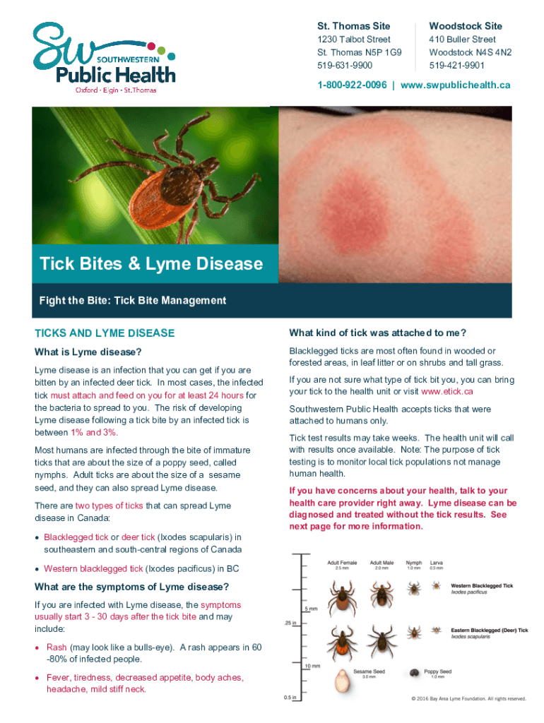St. Thomas Site Woodstock Site1230 Talbot Street St. Thomas N5P 1G9 5196319900410 Bullet Street Woodstock N4S 4N2 519421990118009220096 | www.swpublichealth.caTick Bites & Lyme Disease Fight the Bite: