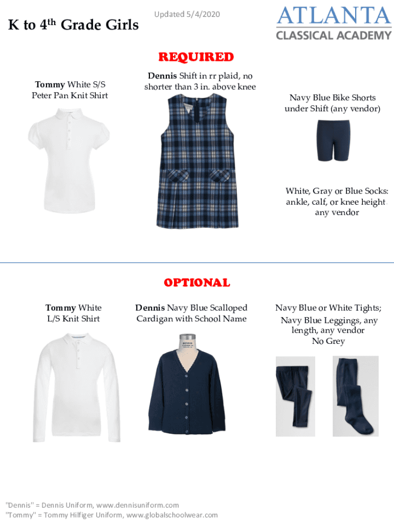 K to4thGrade GirlsUpdated 5/4/2020REQUIRED Tommy White S/S Peter Pan Knit Shirt Dennis Shift in RR plaid, no shorter than 3 in. above knee Navy Blue Bike Shorts under Shift (any vendor)White, Gray