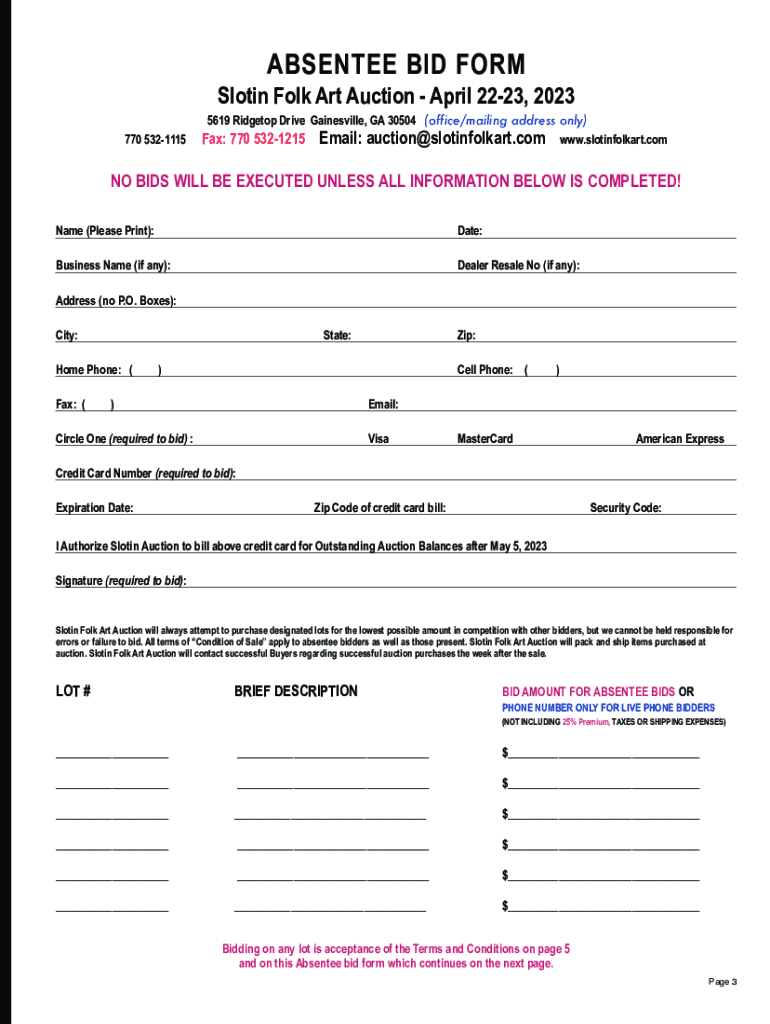 ABSENTEE BID FORM Slot in Folk Art Auction April 2223, 2023 770 53211155619 Ridge top Drive Gainesville, GA 30504 (office/mailing address only) Fax: 770 5321215 Email: auction@slotinfolkart.com www.slotinfolkart.comNO