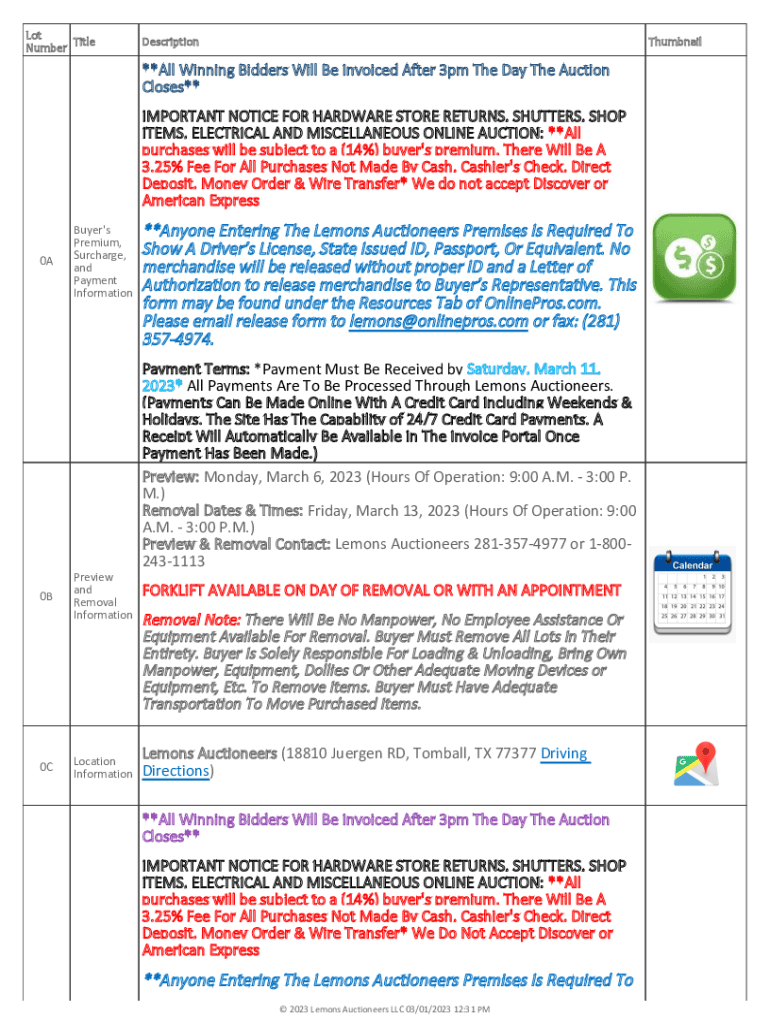 Lot Title NumberDescriptionThumbnail**All Winning Bidders Will Be Invoiced After 3pm The Day The Auction Closes** IMPORTANT NOTICE FOR HARDWARE STORE RETURNS, SHUTTERS, SHOP ITEMS, ELECTRICAL AND
