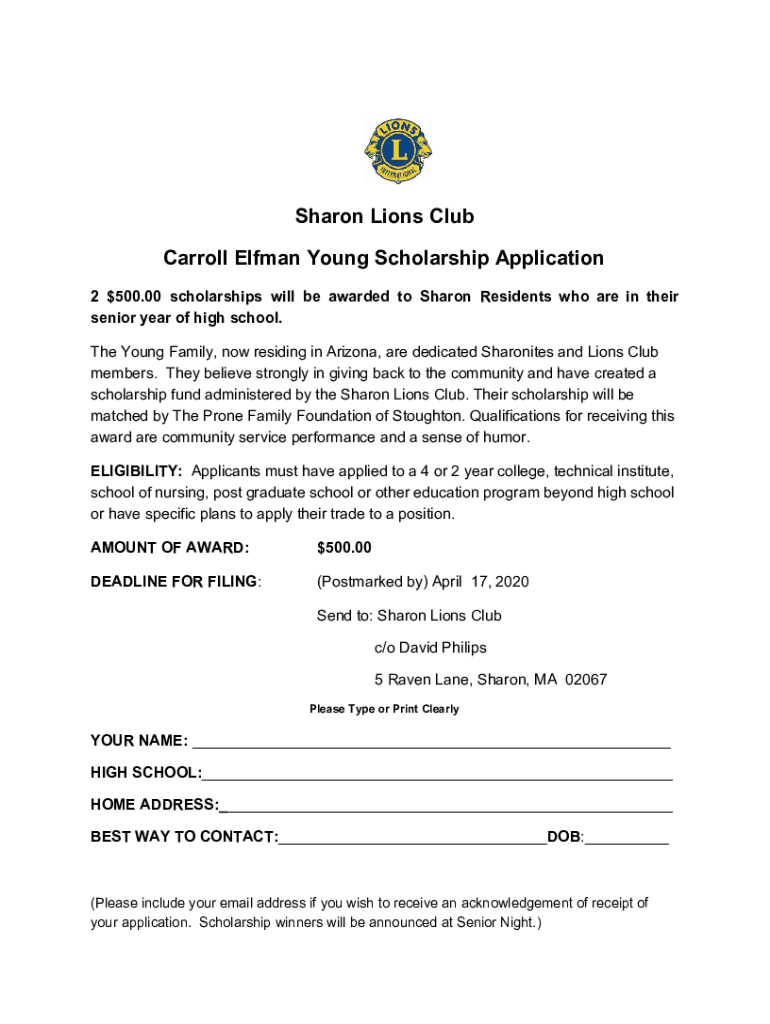 Get the free Sharon Lions Club Carroll Elfman Young Scholarship ...