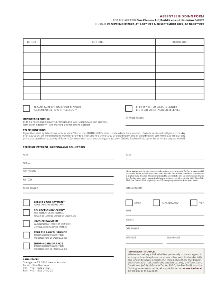 ABSENTEE BIDDING FORM FOR THE AUCTION Fine Chinese Art, Buddhism and Hinduism CA0922 ON DATE 29 SEPTEMBER 2022, AT 1:00 PM CET & 30 SEPTEMBER 2022, AT 10:00AM CELLO NR.LOT TITLE BID IN EUROPEAN RAISE