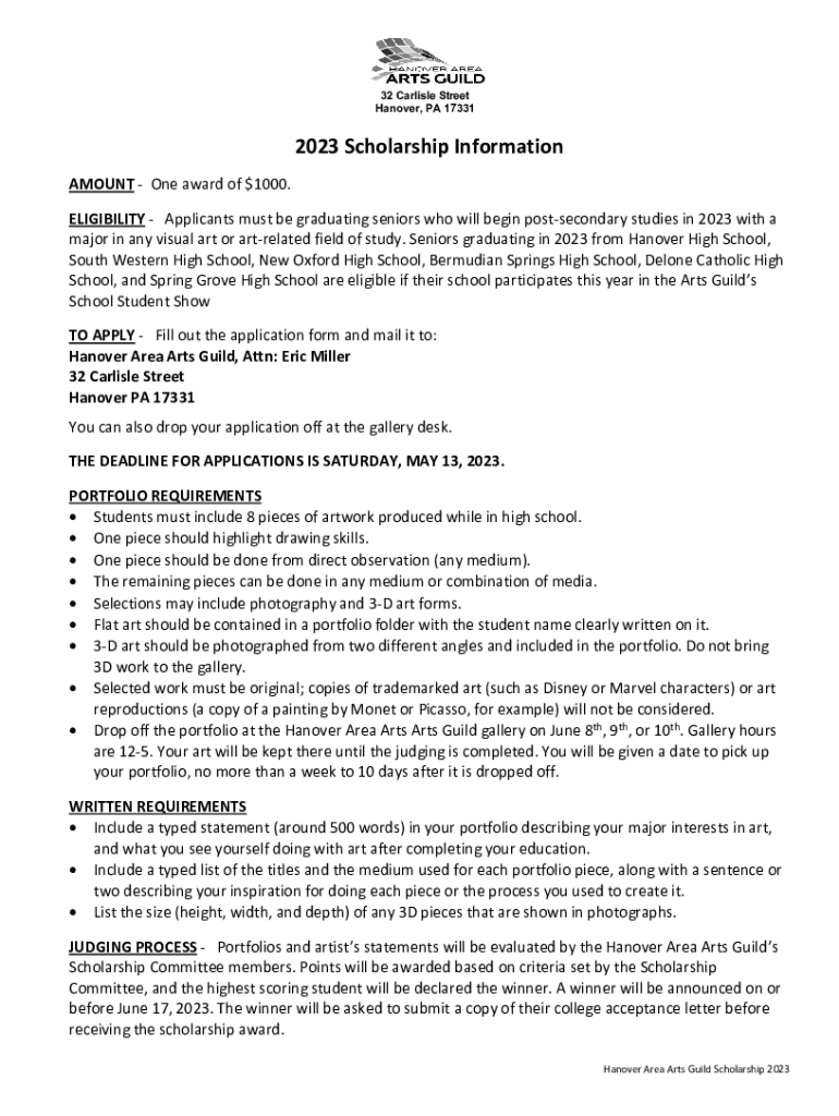 32 Carlisle Street Hanover, PA 173312023 Scholarship Information AMOUNT One award of $1000. ELIGIBILITY Applicants must be graduating seniors who will begin postsecondary studies in 2023 with a major