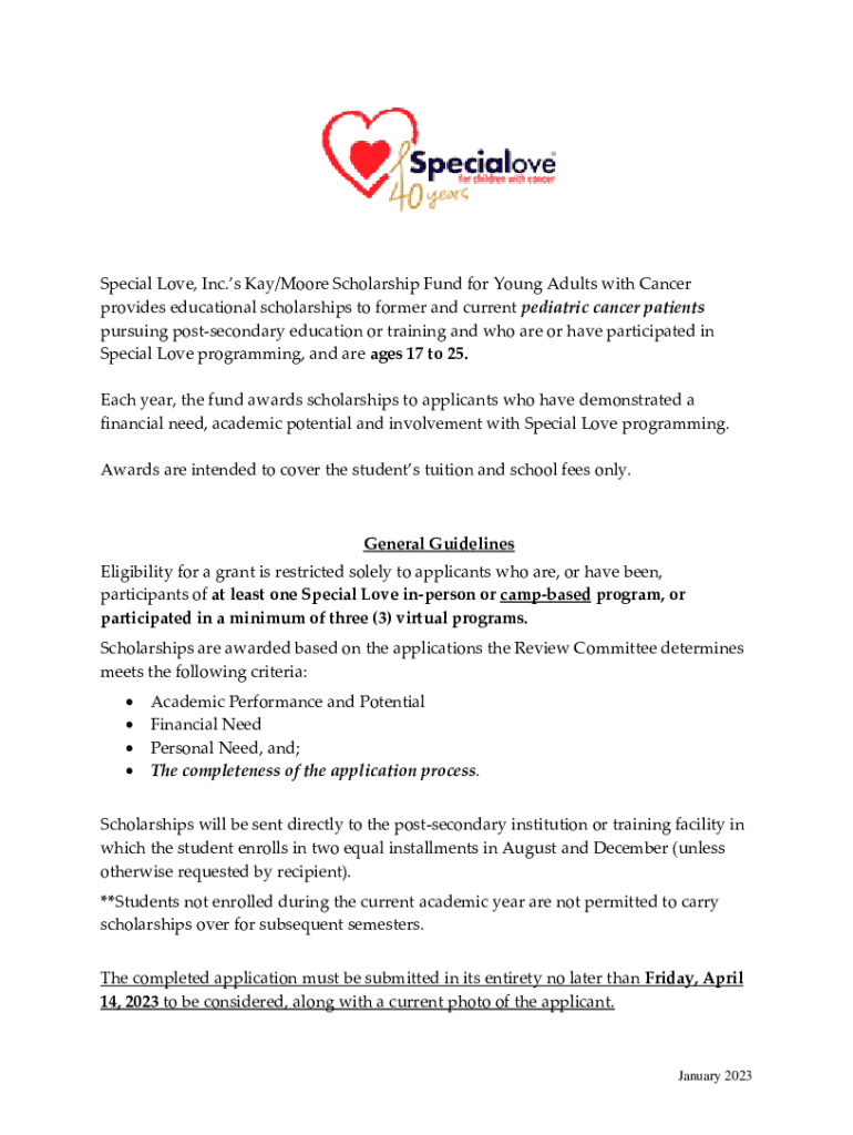 Special Love, Inc.s Kay/Moore Scholarship Fund for Young Adults with Cancer provides educational scholarships to former and current pediatric cancer patients pursuing postsecondary education or training