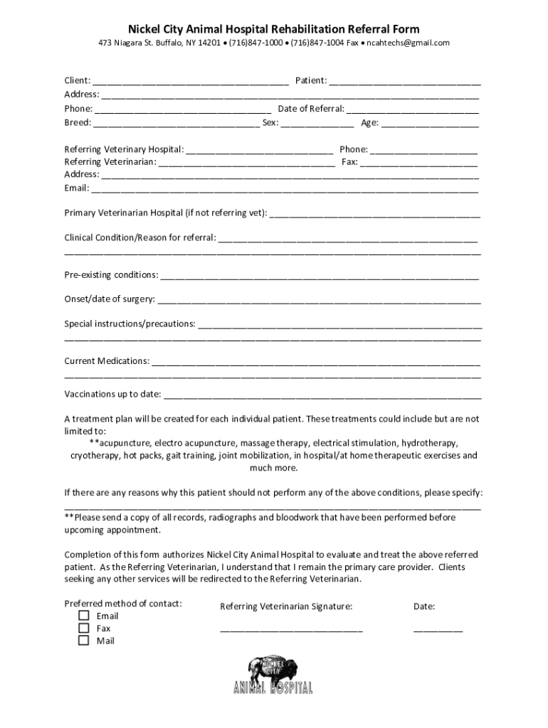 Nickel City Animal Hospital Rehabilitation Referral Form 473 Niagara St. Buffalo, NY 14201 (716)8471000 (716)8471004 Fax ncahtechs@gmail.comClient: ___ Patient: ___ Address: ___ Phone: ___ Date of