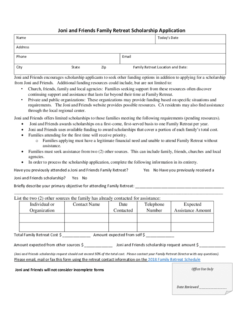 Joni and Friends Family Retreat Scholarship Application NameTodays Headdress Phone CityEmail StateZipFamily Retreat Location and Date:Joni and Friends encourages scholarship applicants to seek other
