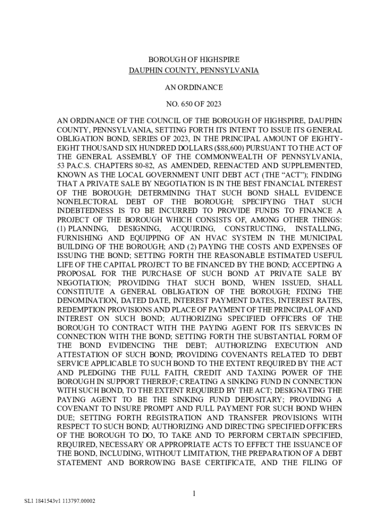 BOROUGH OF HIGHS PIRE DAUPHIN COUNTY, PENNSYLVANIA AN ORDINANCE NO. 650 OF 2023 AN ORDINANCE OF THE COUNCIL OF THE BOROUGH OF HIGHS PIRE, DAUPHIN COUNTY, PENNSYLVANIA, SETTING FORTH ITS INTENT TO