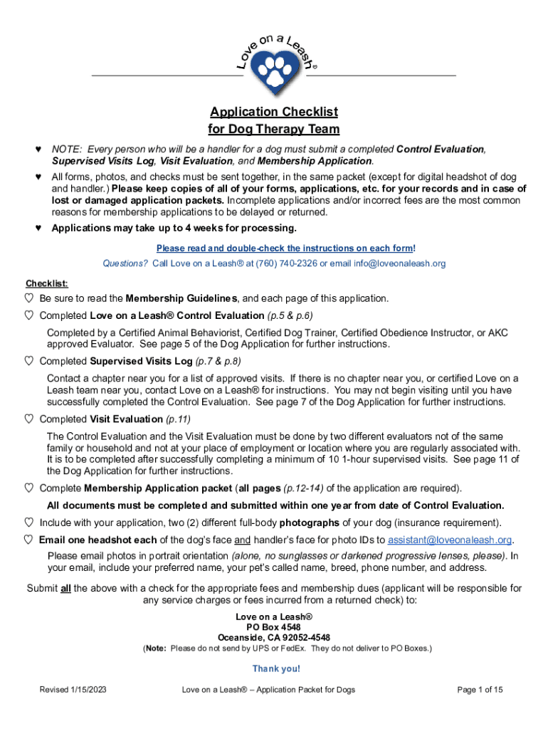 Application Checklist for Dog Therapy Team NOTE: Every person who will be a handler for a dog must submit a completed Control Evaluation, Supervised Visits Log, Visit Evaluation, and Membership Application.