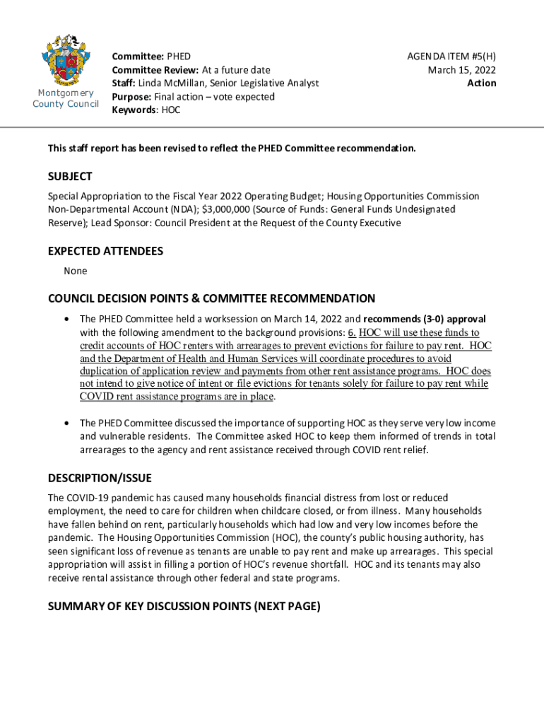 Montgomery County CouncilCommittee: PhD Committee Review: At a future date Staff: Linda McMillan, Senior Legislative Analyst Purpose: Final action vote expected Keywords: AGENDA ITEM #5(H) March 15,