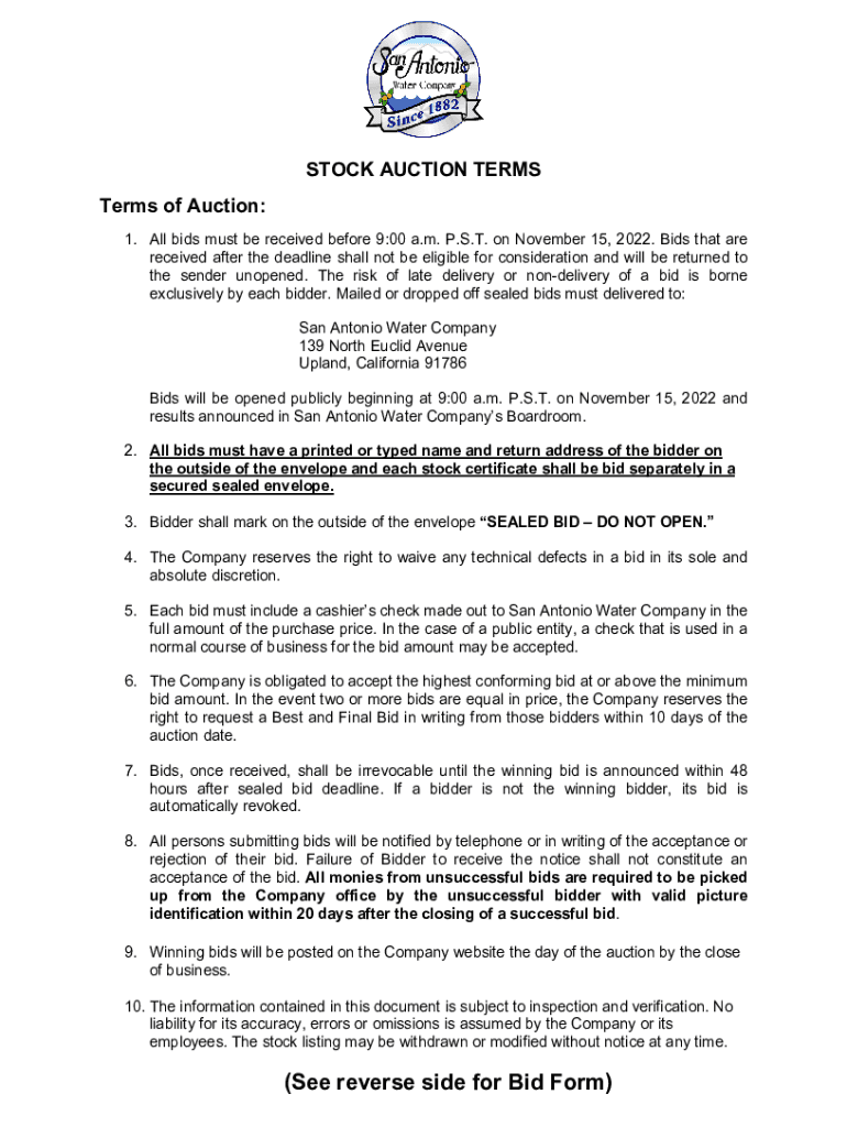 STOCK AUCTION TERMS of Auction: 1. All bids must be received before 9:00 a.m. P.S.T. on November 15, 2022. Bids that are received after the deadline shall not be eligible for consideration and will