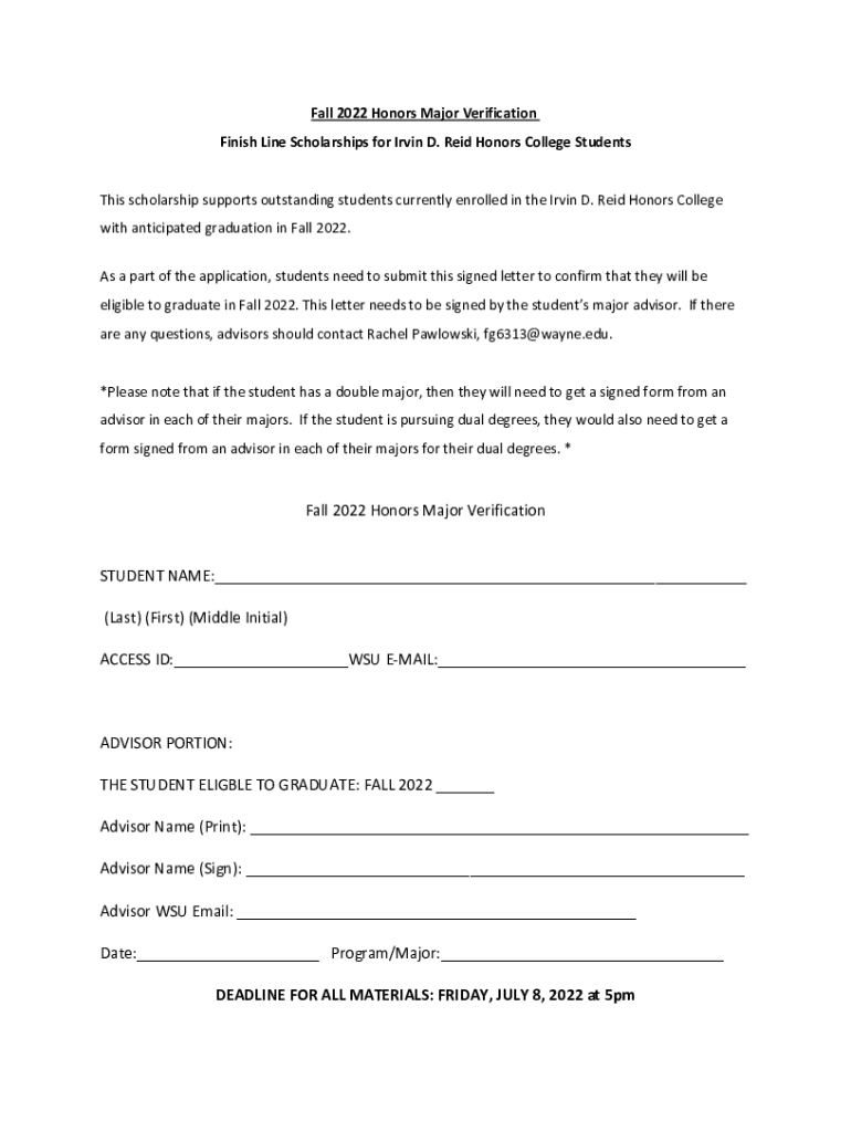 Fall 2022 Honors Major Verification Finish Line Scholarships for Irvin D. Reid Honors College Studentship scholarship supports outstanding students currently enrolled in the Irvin D. Reid Honors College