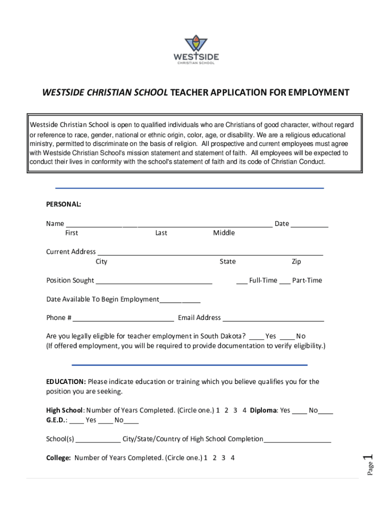 Get the free WESTSIDE CHRISTIAN SCHOOL TEACHER APPLICATION ...