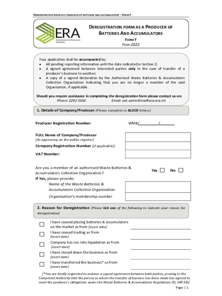 DEREGISTRATION FORM AS A PRODUCER OF BATTERIES AND ACCUMULATORS FORM DEREGISTRATION FORM AS A PRODUCER OF BATTERIES AND ACCUMULATORS FORM YEAR 2022Your application shall be accompanied by: All pending